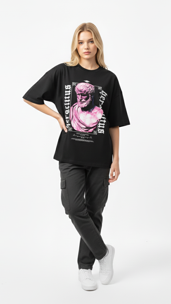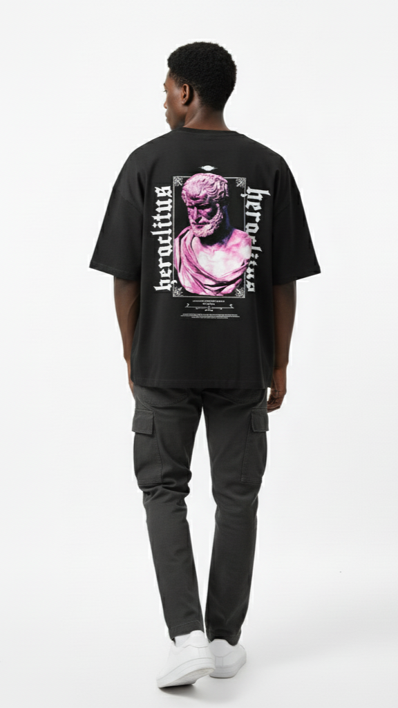 A bold reminder from the philosopher of change. This tee embodies Heraclitus’ timeless truth that who we are within determines the path we walk. Minimal yet powerful, it’s a design for those who live with intention and let their actions define their destiny.